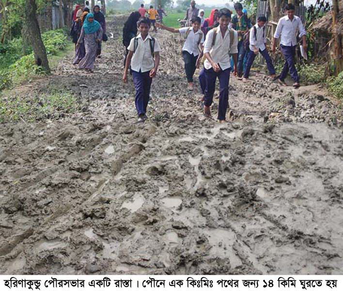আহমেদ নাসিম আনসারী,ঝিনাইদহ প্রতিনিধি,এসবিডি নিউজ24 ডট কমঃ ঝিনাইদহের হরিণাকুন্ডু পৌরসভার ৫নং ওয়ার্ডের সিঙ্গা গ্রামে মাত্র পৌনে এক কিলোমিটার রাস্তার বেহাল দশার কারনে গ্রামবাসিকে ১৪ কিলোমিটার পথ ঘুরে হরিণাকুন্ডু শহরে আসতে হয়। এলাকাবাসী জানায় হরিণাকুন্ডু উপজেলার সঙ্গে যোগাযোগের গুরত্বপূর্ণ সড়ক ভালকী বাজার হতে সিঙ্গা সড়ক। সড়কটির দৈর্ঘ্য মাত্র আট কিলোমিটার। এই আট কিলো মিটার সড়কের মধ্যে সাড়ে তিন কিলোমিটার পৌরসভার ও সাড়ে চার কিলোমিটার এলজিইডির। ২টি ইউনিয়ন এবং পৌর এলাকাসহ পার্শ্ববর্তী অঞ্চলের মানুষ প্রতিনিয়ত এই রাস্তা দিয়ে যাতায়াত করে থাকেন। কিন্তু পানি কাদায় সড়কের অবস্থা বেহাল। স্কুল কলেজের শিক্ষার্থীরা কাদা ভেঙ্গে হরিণাকুন্ডু শহরে পড়ালেখা করে থাকে।
