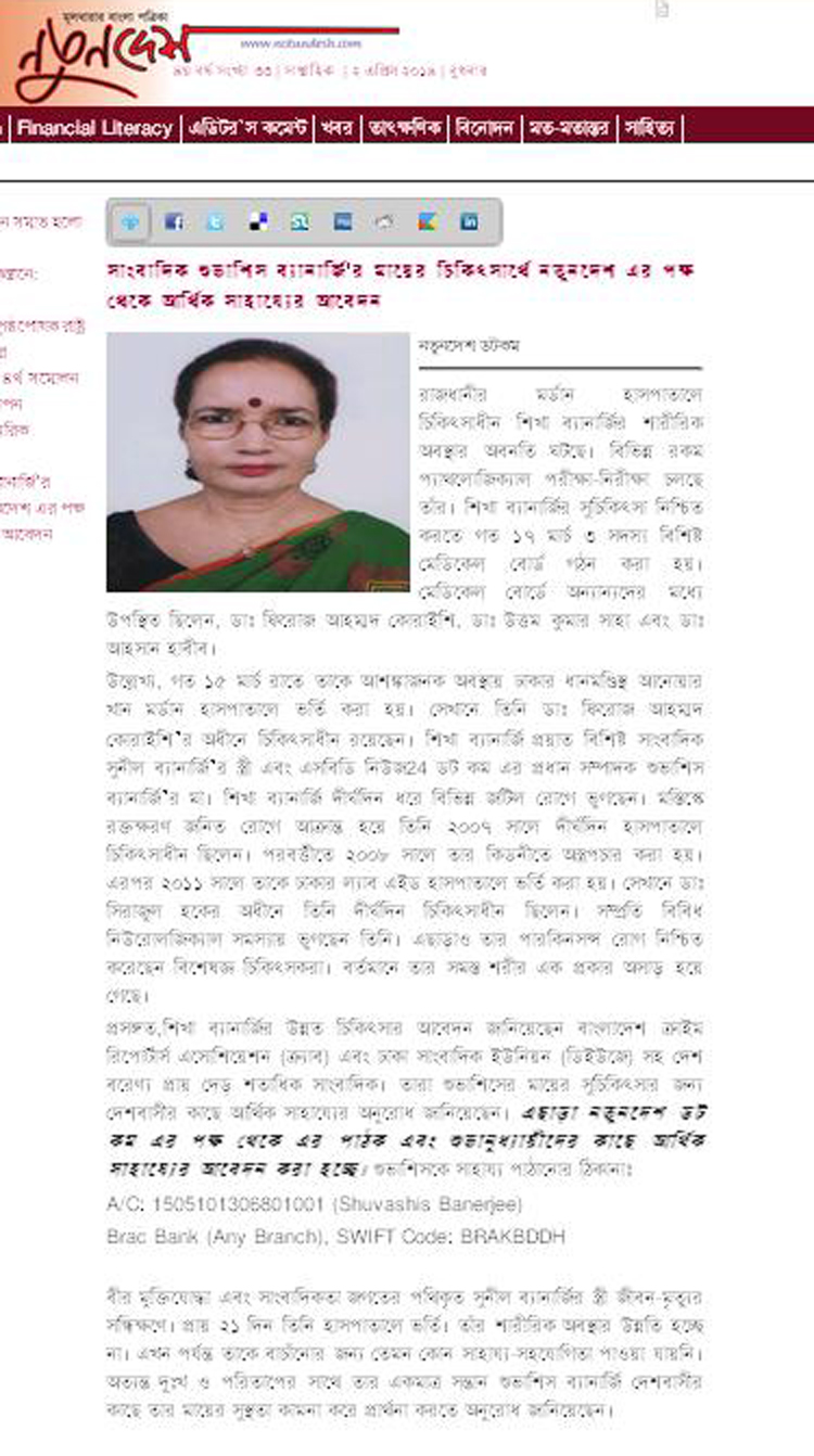 সাংবাদিক শুভাশিস ব্যানার্জি’র মায়ের চিকিৎসার্থে নতুনদেশ এর পক্ষ থেকে আর্থিক সাহায্যের আবেদন