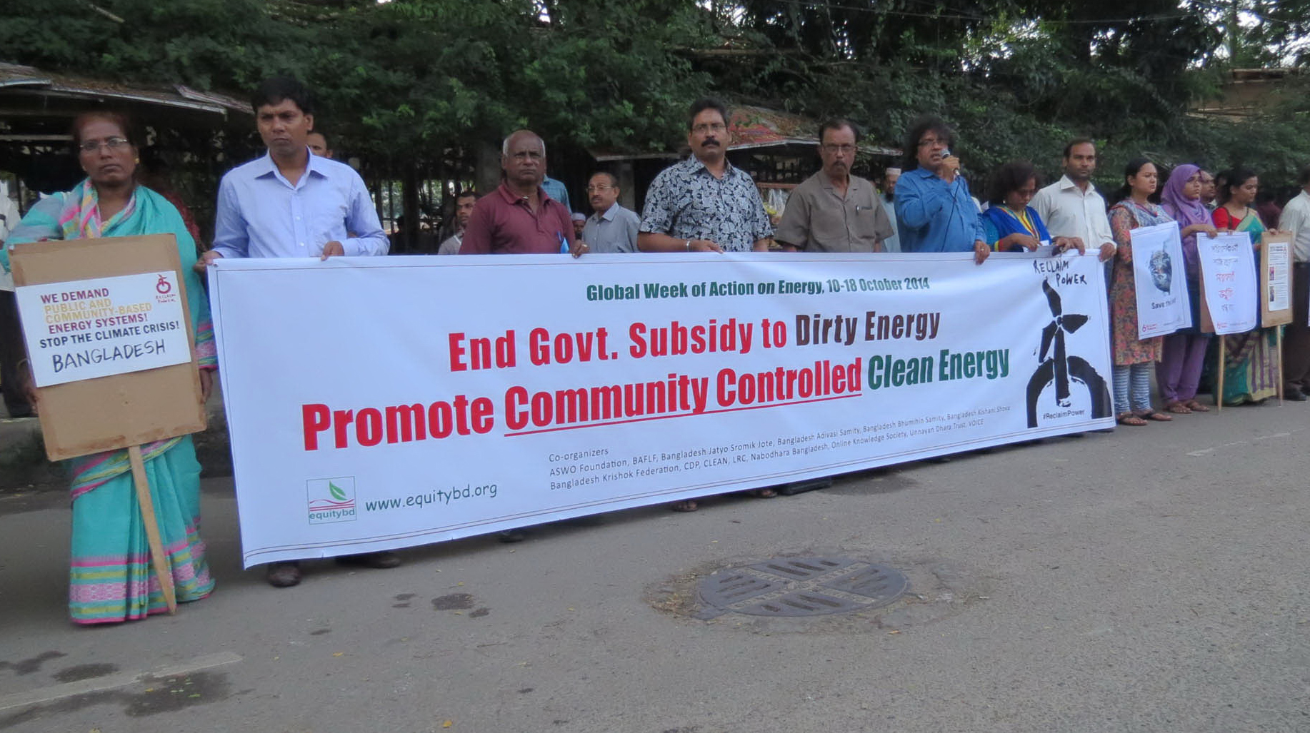 উক্ত র্যালি ও মানববন্ধন আয়োজন করা হয় বিশ্বব্যাপী চলমান ‘রিক্লেইম পাওয়ার’ শীর্ষক একটি বৈশ্বিক কর্মসূচি সপ্তাহের অংশ হিসেবে। ইক্যুইটিবিডি’র মোস্তফা কামাল আকন্দের সঞ্চালনায় মানববন্ধনে বক্তব্য রাখেন জাতীয় শ্রমিক জোটের ড. মেজবাহ উদ্দিন আহমেদ, বাংলাদেশ কৃষক ফেডারেশনের বদরুল আলম এবং ইক্যুইটিবিডি’র রেজাউল করিম চৌধুরী। সহ-আয়োজক সংগঠনগুলো হচ্ছে অনলাইন নলেজ সোসাইটি, উন্নয়ন ধারা ট্রাস্ট, এলআরসি, এসো ফাউন্ডেশন, কমিউনিটি ডেভেলপমেন্ট পার্টনারশিপ, ক্লিন, নবধারা বাংলাদেশ, বাংলাদেশ আদিবাসী সমিতি, বাংলাদেশ কিষাণী সভা, বাংলাদেশ কৃষক ফেডারেশন, বাংলাদেশ ভ’মিহীন সমিতি, জাতীয় শ্রমিক জোট, বিএএফএলএফ এবং ভয়েস। মোস্তফা কামাল আকন্দ গ্রুপের পক্ষে লিখিত বক্তব্য পাঠ করেন যেখানে সুস্পষ্ট চারটি দাবি উল্লেখ করা হয়: (১) নোংরা জ্বালানির (কার্বন উদগীরণকারী) যে প্রকল্পগুলো রয়েছে তা অবিলম্বে বন্ধ বা বাতিল করতে হবে; (২) নোংরা জ্বালানি ব্যবহারকারী শক্তি প্রকল্পে সরকারী ভর্তুকি বা জনগণের প্রাপ্য সম্পদ ব্যয় বন্ধ করতে হবে। আমেরিকার শেভরন কোম্পানির কর পরিশোধ করে বাংলাদেশ সরকার, যা মূলত জনগণের অর্থ। (৩) বিশ্বের অভিজাত ও ধনী করপোরেশনগুলোর জ্বালানির অতি ব্যবহার (ভোগ) বন্ধ করতে হবে। (৪) সরকারকে জীবাশ্ম জ্বালানি হতে ভর্তুকি প্রত্যাহার করে তা জনগণ-নিয়ন্ত্রিত নবায়নযোগ্য জ্বালানি ব্যবস্থায় স্থানান্তর করতে হবে।