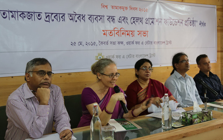 ২৫ মে (সোমবার) সকাল ১১টায় ওয়ার্ক ফর এ বেটার বাংলাদেশ (ডাব্লিউবিবি) ট্রাস্ট এর উদ্যোগে সংস্থার কৈবর্ত সভাকক্ষে অনুষ্ঠিত মতবিনিময় সভায় স্বাস্থ্য বিশেষজ্ঞগণ উপরোক্ত পরামর্শ প্রদান করেন। আসন্ন বিশ্ব তামাকমুক্ত দিবস ২০১৫ (৩১ মে) উদযাপন উপলক্ষে ‘তামাকের অবৈধ ব্যবসা বন্ধ ও হেলথ প্রমোশন ফাউন্ডেশন প্রতিষ্ঠা’ শীর্ষক মতবিনিময় সভায় সভাপতিত্ব করেন বাংলাদেশ তামাক বিরোধী জোটের সমন্বয়কারী সাইফুদ্দিন আহমেদ। সভায় প্রধান অতিথি ছিলেন স্বাস্থ্য ও পরিবার কল্যাণ মন্ত্রণালয়ের অতিরিক্ত সচিব (জনস্বাস্থ্য ও বিশ্বস্বাস্থ্য) রোকসানা কাদের। আলোচনা করেন ইউনাইটেড ফোরাম এগেইনেস্ট টোব্যাকো (উফাত) এর সাংগঠনিক সম্পাদক অধ্যাপক ডা. সোহেল রেজা চৌধুরী ও ফ্রান্সভিত্তিক জনস্বাস্থ্য উন্নয়নে বৈশ্বিক প্রতিষ্ঠান দি ইন্টারন্যাশনাল ইউনিয়ন এগেইনেস্ট টিউবরকুলোসিস এন্ড লাং ডিজিজ (দি ইউনিয়ন) এর কারিগরি পরামর্শক এডভোকেট সৈয়দ মাহবুবুল আলম। সভায় আন্তর্জাতিক অভিজ্ঞতার আলোকে হেলথ প্রমোশন ফাউন্ডেশন প্রতিষ্ঠার প্রয়োজনীয়তা বিষয়ে প্রবন্ধ উপস্থাপন করেন আন্তর্জাতিক অঙ্গণে খ্যাতিমান জনস্বাস্থ্য বিশেষজ্ঞ, কানাডাভিত্তিক জনস্বাস্থ্য বিষয়ক প্রতিষ্ঠান হেলথব্রিজ এর আঞ্চলিক পরিচালক দেবরা ইফরমসন।