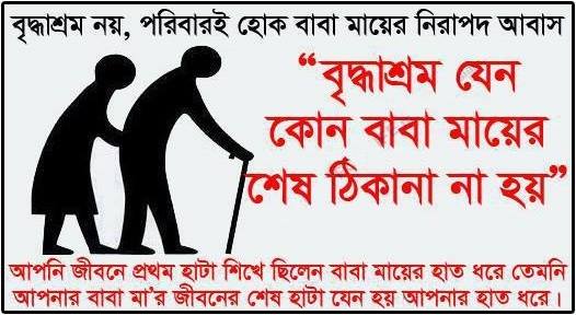 শেষ কথা: পিতা-মাতার পাশে মানবতার অন্যতম একটি কলংকিত নাম হলো বৃদ্ধাশ্রম,সত্যিই যাহা বেমানান এবং দুনিয়ার সবচেয়ে ঘৃনিত আবাসের নামটিও বৃদ্ধাশ্রম। ভাবতে  অবাক লাগে যেই  পিতা-মাতা এত কষ্ট করে সন্তান্দের লালন পালন করে বড় করলো, শিক্ষিত করলো আর সেই সব সন্তানেরা পিতা-মাতা বৃদ্ধ হলে কিভাবে তাদের বৃদ্ধাশ্রম নামক কারাগারে পাঠাতে পারে! এত নির্মমমতা কিভাবে আপন সন্তানেরা অসহায় পিতা-মাতার প্রতি করে থাকে। সেই সব সন্তানেরা কি একটুও ভাবেনা কোন একদিন তাদের জীবনেও এই রকম পরিনতি আসতে পারে। তারাও একদিন ‘বৃদ্ধাশ্রম’ নামক কলংকিত কারাগারে নিক্ষিপ্ত হতে পারেন,আর সবচেয়ে আশ্চর্যের ব্যাপার হলো সমাজের শিক্ষিত অংশেই এই বৃদ্ধাশ্রম সংস্কৃতিটা বেশী পরিলক্ষিত হয়। তাই আজ বলতেই হয় শিক্ষিত হওয়ার পরও সেই সব সন্তানেরা মানুষ হতে পারেনি। এক নির্ভেজাল সত্যের মুখোমুখি দাঁড়িয়েছি আমরা এবং আমাদের সমাজ। বর্তমান প্রজন্মের মুখ থেকে শুনতে চাই,তারা যেন ‍দীপ্ত কন্ঠে ঘোষণা করে,“আমাদের পিতা-মাতার জন্য কোন বৃদ্ধাশ্রম নির্মানের প্রয়োজন নেই”। ক্ষনিকের সুখ পেতে কেউ যেন দীর্ঘস্থায়ী সুখ ও পৃথিবীর শ্রেষ্ঠ সম্পদ পিতা-মাতাকে নির্বাসনে না পাঠায় । যে গৃহে পিতা-মাতা আছে সে গৃহের সুখ কোন পার্থিব সম্পদের বিনিময়ে বদল করা আদৌ সম্ভব নয়। প্রতিটি সন্তানের কাছে বিনীত অনুরোধ,বাবা-মা যেন কোন ব্যাপারে কষ্ট না পায়। মৃত্যুর পূর্বক্ষণ পর‌্যন্ত যেন তারা তাদের সন্তানদের কাছ থেকে হাসি মুখ দেখতে পায়। কেননা পরিবারই কেবল পিতা-মাতার নিরাপদ আবাস স্থল হতে পারে।