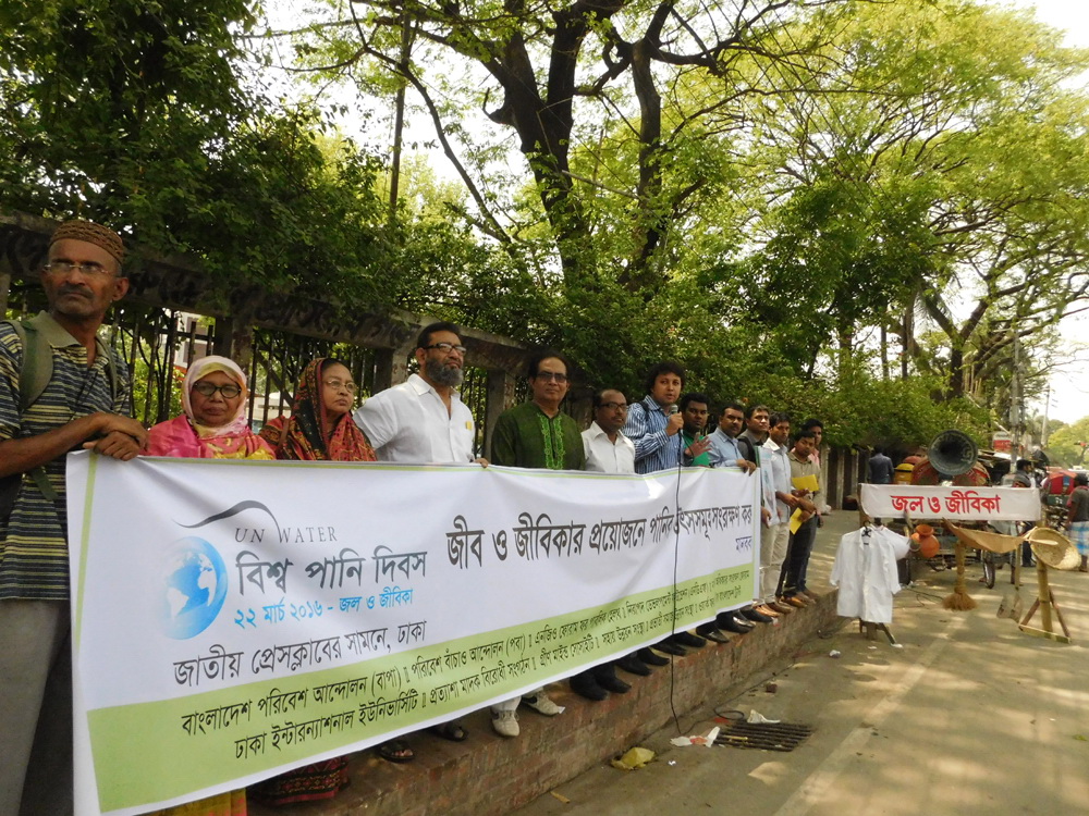 জনগণের অংশগ্রহণের মাধ্যমে পানি অধিকার ও পানির নিরাপত্তা নিশ্চিত করা প্রয়োজন। ২২ মার্চ (মঙ্গলবার) সকাল ১১টায় পরিবেশ বাঁচাও আন্দোলন (পবা), বাংলাদেশ পরিবেশ আন্দোলন (বাপা), ওয়ার্ক ফর এ বেটার বাংলাদেশ ট্রাস্ট, এনজিও ফোরাম ফর পাবলিক হেলথ, ঢাকা ইন্টারন্যাশনাল ইউনিভার্র্সিট, এনডিএফ, নাগরিক অধিকার সংরক্ষণ ফোরাম (নাসফ), প্রত্যাশা মাদক বিরোধী সংগঠন, গ্রীন মাইন্ড সোসাইটি, সহায় উন্নয়ন সংস্থা এবং প্রভাতী সমাজ উন্নয়ন সংস্থা এর য্যেথ উদ্যোগে জাতীয় প্রেসক্লাব এর সামনে “জীব ও জীবিকার প্রয়োজনে পানির উৎসসমূহ সংরক্ষণ করা হোক” শীর্ষক মানববন্ধনে বক্তরা এই অভিমত ব্যক্ত করেন।সভাপতির বক্তব্যে পরিবেশ বাঁচাও আন্দোলন পবা’র চেয়ারম্যান আবু নাসের খান বলেন, পানির সঙ্কটে শুধু জীব ও জনস্বাস্থ্য নয়, শিল্পায়ন ও হুমকির সম্মুখীন। পানি সম্পদের সঠিক ব্যবহারের অভাব এবং মানবসৃষ্ট কারণে পানির নিরাপদ উৎসগুলো নষ্ট হয়ে যাচ্ছে। পানি দূষণ বৃদ্ধি এবং পানির গুণগত মান নষ্ট হওয়ায় বিশুদ্ধ পানির সংকট দেখা দিচ্ছে। পানিসম্পদের অপব্যবহার রোধে তৃণমূল থেকে জাতীয় পর্যায়ে কর্মসূচি গ্রহণ করতে হবে।