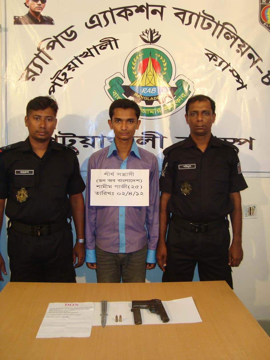 র্যাব – ৮ পটুয়াখালী ক্যাম্প অধিনায়ক লেফটেনেন্ট কমান্ডার নুর উজ জামান জানান, ধৃত শামীম নিজেকে ‘‘ডন আব বাংলাদেশ’’ নামে পরিচয় দিয়ে আসছিলো। সে দীর্ঘদিন ধরে অবৈধ অস্র্ ব্যবসার সাথে জড়িত। শামীমের বেপরোয়া চাঁদাবাজীতে এলাকার সাধারন মানুষ জিম্মি হয়ে পরেছিলো। গোপন সংবাদের ভিত্তিতে অভিযান চালিয়ে তাকে ১টি মএম পিস্তল (ইউএস), ২ রাউন্ড গুলি ও ১টি বিদেশী ছোড়া সহ আটক করা হয়েছে।