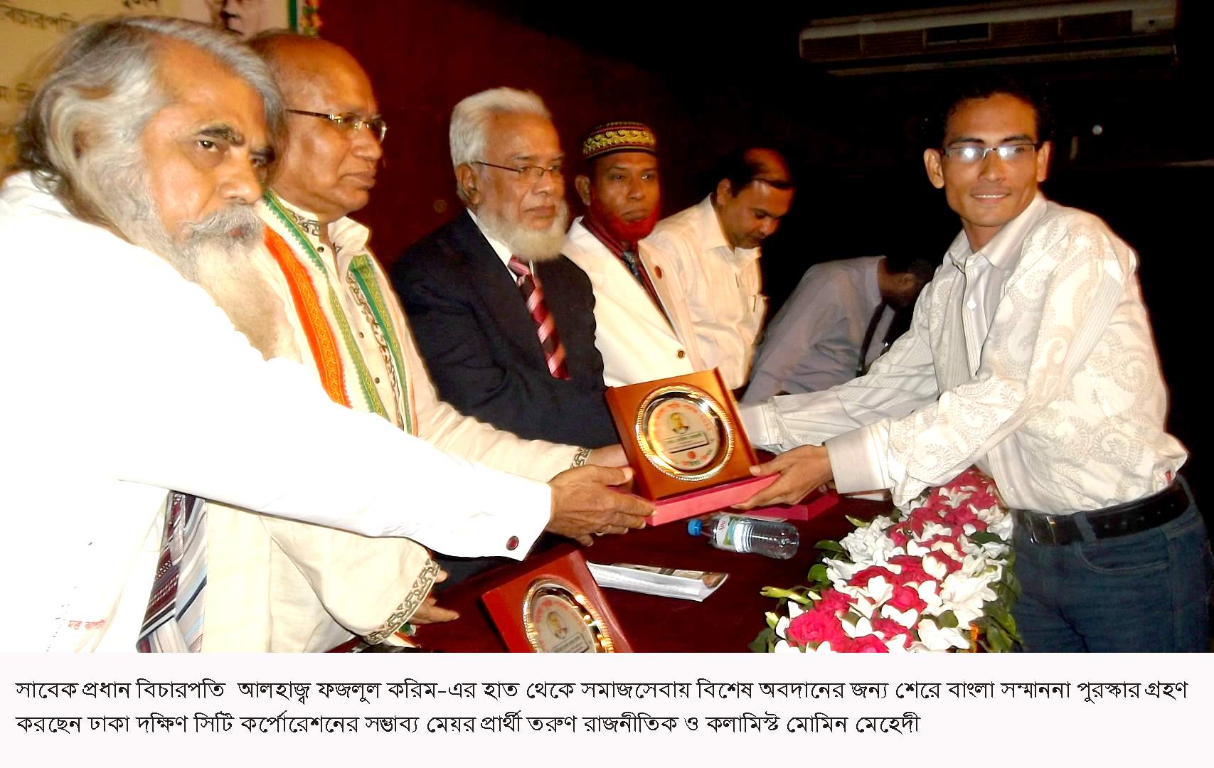 এসবিডি নিউজ24 ডট কম,ডেক্সঃ ‘নিরাপদ ও বাসযোগ্য ঢাকা গড়তে’ ‘তরুণ আলোয় গড়বো দেশ বঙ্গবন্ধু’র বাংলাদেশ’ এই শ্লোগানকে ধারণ করে এগিয়ে আসা ঢাকা দক্ষিণ সিটি কর্পোরেশন নির্বাচনে সম্মিলিত সচেতন নাগরিক সমাজ-এর সম্ভাব্য মেয়র প্রার্থী তরুণ রাজনীতিক ও কলামিস্ট মোমিন মেহেদী সমাজসেবায় বিশেষ অবদানের স্বীকৃতি সরম্নপ শেরে বাংলা সম্মাননা পুরস্কার পেয়েছেন। ১৭ এপ্রিল সন্ধ্যা ৬ টায় জাতীয় জাদুঘরে অনুষ্ঠিত এক আয়োজনে সাবেক প্রধান বিচারপতি আলহাজ্ব ফজলুল করিম এ সম্মাননা মোমিন মেহেদীর হাতে তুলে দেন। একাত্তর মিডিয়া ভিশনের সভাপতি কবি মুহম্মদ আবদুল খালেকের সভাপতিত্বে ও সংগঠনের সহ-সভাপতি মঞ্জুর হোসেনের উপস্থাপনায় অনুষ্ঠিত আলোচনা সভা ও সম্মাননা প্রদান অনুষ্ঠানে প্রধান আলোচক ছিলেন ঢাকা বিশ্ববিদ্যালয়ের উপাচার্য অধ্যাপক ড. আ আ ম স আরেফিন সিদ্দিক।