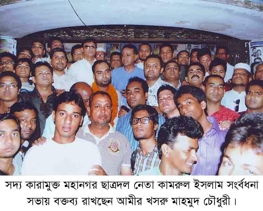 জালালউদ্দিন সাগর, এসবিডি নিউজ24ডটকমঃ ২৫ মার্চ চট্টগ্রামের দলীয় কার্যালয় নাসিমন ভবনে সদ্য কারামুক্ত চট্টগ্রাম মহানগর ছাত্রদলের সহ-সাধারণ সম্পাদক কামরুল ইসলাম ১২ ই মার্চ চলো চলো ঢাকা চলো কর্মসূচীতে যোগ দিতে গিয়ে চট্টগ্রাম রেলষ্টেশন থেকে গ্রেফতার হয়ে দীর্ঘদিন কারা ভোগের পর হাইকোর্ট থেকে জামিন পায়। কামরুল ইসলামের কারামুক্তি কারনে মহানগর ছাত্রদলের উদ্যোগে সংবর্ধনা অনুষ্ঠানে প্রধান অতিথির ভাষণে বি.এন.পি চেয়ারপার্সনের উপদেষ্টা ও সাবেক মন্ত্রী চট্টগ্রাম মহানগর বি.এন.পির সভাপতি আমীর খসরু মাহমুদ চেমধুরী এ কথা বলেন। উক্ত অনুষ্ঠানে প্রধান বক্তা হিসেবে উপস্থিত ছিলেন চট্টগ্রাম মহানগর বি.এন.পির সাধারণ সম্পাদক ডাঃ শাহাদাত হোসেন।