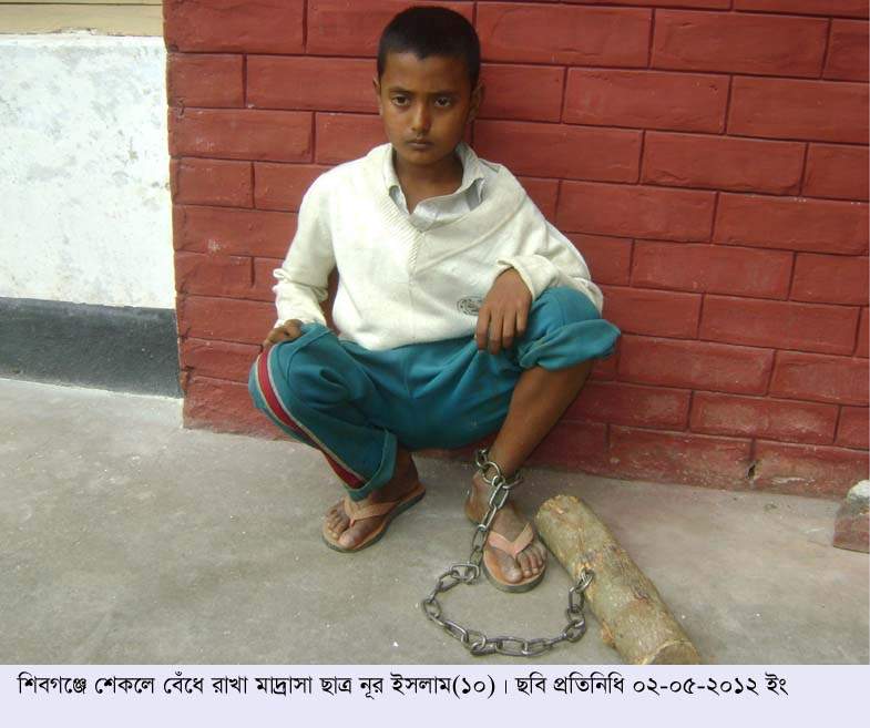 থানা পুলিশ ও মাদ্রাসা সূত্র জানায়, গত মঙ্গলবার শিবগঞ্জ হেলিপ্যাড এলাকায় অবস্থিত ওই মাদ্রাসা থেকে পালিয়ে যায় নূর ইসলাম। পরে তার বাবা জালাল উদ্দিন তাকে ধরে এনে মাদ্রাসায় রেখে গেলে কর্তৃপক্ষ তার বাম পায়ে শেকল পরিয়ে বেঁধে রাখে। রাতে বেদম মারপিট করা হয় তাকে। এরপর বুধবার সকালে একটি খুঁটির সঙ্গে শেকল আটকিয়ে মাদ্রাসা মাঠে বেঁধে রাখা হয় নূরকে। দুপুরের দিকে সকলের চোখ ফাঁকি দিয়ে সেই খুঁটি উপড়িয়ে চম্পট দেয় নূর। গিয়ে আশ্রয় নেয় শিবগঞ্জ উপজেলা পরিষদের মহিলা ভাইস চেয়ারম্যানের বাসায়। পরে ভাইস চেয়ারম্যান বিউটি বেগম তাকে উপজেলা পরিষদে নিয়ে এলে শুরু হয় তুমুল হৈ চৈ।