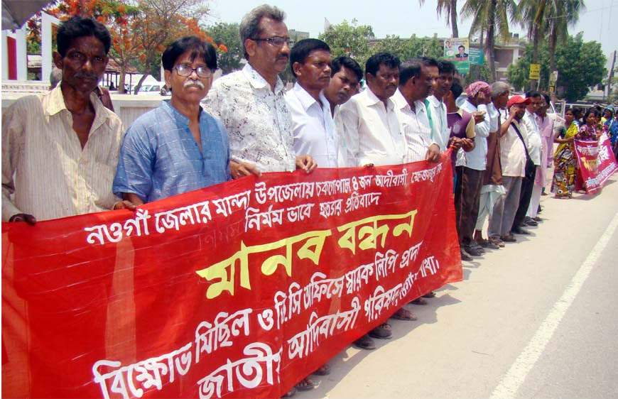 নওগাঁয় চার আদিবাসী হত্যার প্রতিবাদে মানববন্ধন