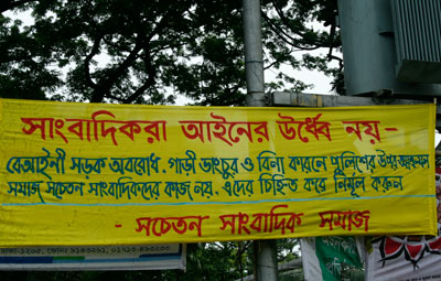 ‘সচেতন সাংবাদিক সমাজ’-এর নামে ‘সাংবাদিকরা আইনের উর্ধ্বে নয়’ শিরোনামের ব্যানারে লেখা হয়েছে: “বেআইনি সড়ক অবরোধ, গাড়ি ভাঙচুর, বিনা কারণে পুলিশের ওপর আক্রমণ সমাজ সচেতন সাংবাদিকদের কাজ নয়। এদের চিহ্নিত করে নির্মূল করুন।“