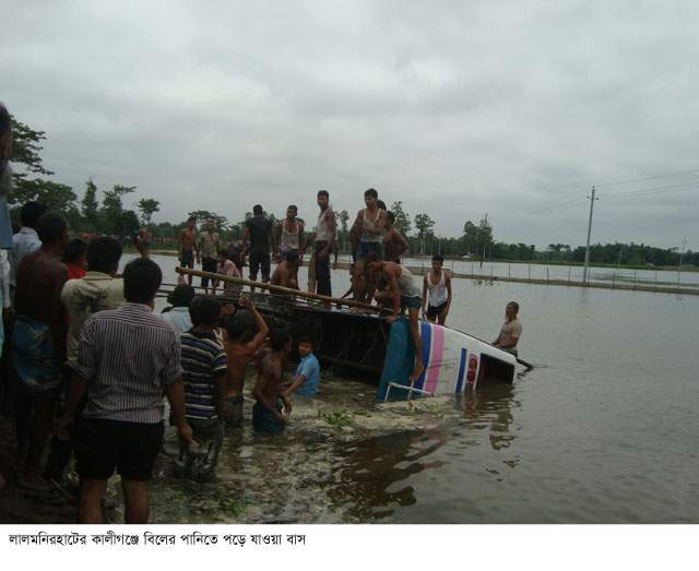 প্রত্যÿদর্শীরা জানান, উপজেলার ভোটমারী এলাকায় রংপুর থেকে ছেড়ে আসা পাটগ্রাম গামী যাত্রীবাহি অনিন্দ্য পরিবহন নামের একটি বাস গতকাল বিকেল ৫টার দিকে ওই এলাকার নিমাণাধীন কালভাটের পাশ দিয়ে তৈরি বাইপাস রোড পার হওয়ার সময় উল্টে ডান পাশে থাকা বিলে পড়ে ডুবে যায়। খবর পেয়ে ঘটনাস্থলে ছুটে আসা স্থানীয় জনতা প্রাথমিক ভাবে তারা উদ্ধার কাজ চালায়। পরে পুলিশ ও ফায়ার সাভির্স কর্মীরা উপস্থিত হয়ে তারাও উদ্ধার কাজ চালাতে থাকে। বাসে থাকা কিছু যাত্রী লাফ দিয়ে নেমে পরে এতে উপজেলার কাকিনা বাজার এলাকার কমর উদ্দিনের ৯ মাসের শিশুপুত্র সালিম নিহত হয়। তার পরিবারের কয়েকজন মহিলা শিশু সমত্মান সহ হাতিবান্ধা আত্নীয়র বিয়ে বাড়িতে যাওয়ার পথে দুর্ঘটনার কবলে পড়ে একই পরিবারের লিজা (৯), হৃদয়(৭) সোনিয়া (৩২) সহ কমপÿÿ ২০ জন আহত হয়। এদিকে বাসটি পানির নিচে ডুবে থাকায় ভিতরে আটকে পরা যাত্রীর সন্ধান পাওয়া যাচ্ছে না এতে মৃতের সংখ্যা বাড়তে পারে। এ রিপোট লেখা পর্যমত্ম উদ্ধার কাজ চলছে। বাসাটি এক নজর দেখতে হাজার হাজার জনতা ঘটনাস্থল যান। এব্যাপারে ঘটনাস্থলে উপস্থিত কালীগঞ্জ থানার এসআই শহিদুল ইসলাম রাত সাড়ে ৮টার দিকে জানান উদ্ধার কাজ চলছে আর কোন লাশ পাওয়া যায়নি।