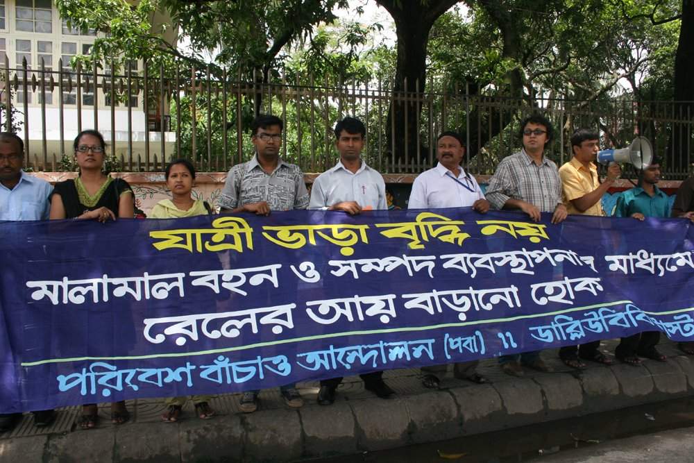 ৪ জুলাই সকাল ১১টায় ঢাকা বিশ্ববিদ্যালয়ের চারুকলা ইনস্টিটিউট এর সামনে এক অবস্থান কর্মসূচীতে বক্তারা উপরোক্ত বক্তব্য রাখেন। পরিবেশ বাঁচাও আন্দোলন (পবা) ও ডাব্লিউবিবি ট্রাস্ট যৌথভাবে এ অবস্থান কর্মসূচী আয়োজন করে। পরিবেশ বাচাও আন্দোলন(পবা)-এর রেল কমিটির আহববায়ক একেএম বদিউর রহমান এর সভাপতিত্বে এবং ডাব্লিউবিবি ট্রাস্ট এর ন্যাশনাল এডভোকেসি কর্মকর্তা মারুফ রহমান এর সঞ্চালনায় এতে বক্তব্য রাখেন এ কে এম সিরাজুল ইসলাম, সোসিও ইকোনোমিক রিসোর্স সেন্টার এর নির্বাহী পরিচালক মো. শাহ্ আলম, ডাব্লিউবিবি ট্রাস্ট এর প্রকল্প সমন্বয়কারী আমিনুল ইসলাম সুজন, পরিবেশ বাঁচাও আন্দোলন (পবা) কর্মসূচী কর্মকর্তা আতিক মোর্শেদ, ইউনাইটেড পীস ফাউন্ডেশন এর উপদেষ্টা সুমন মাহমুদ, বিসিএইচআর এর নির্বাহী পরিচালক মাহবুব হক প্রমুখ।