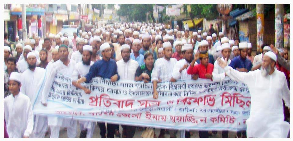 শুক্রবার জুম্মা নামাজের পর জেলা ইমাম-মোয়াজ্জিম কমিটির সভাপতি মাওলানা আব্দুল মজিদের নেতৃত্ব শহরের টাউন মসজিদের সামনে থেকে একটি মিছিলটি বের হয়ে শহরের প্রধান-প্রধান সড়ক প্রদক্ষিন শেষে ব্রীজের মোড়ে গিয়ে শেষ হয়। সেখানে এক প্রতিবাদ সমাবেশ অনুষ্ঠিত হয়। বক্তারা বলেন, বিশ্ব নবী হযরত মুহাম্মদ (সাঃ) কে কটাক্ষ করে চলচিত্র নির্মানের তীব্র প্রতিবাদ এবং দোষীদের দৃষ্টান্তমুলক শাস্তির দাবী জানান। মিছিলে সর্বস্তরের ৭/৮ হাজার মুসল্লী অংশ নেন। এর আগে শহর ও শহরের আশে পাশের বিভিন্ন মসজিদ থেকে মিছিল নিয়ে মুসল্লীরা টাউন মসজিদের সামনে একত্রিত হন।
