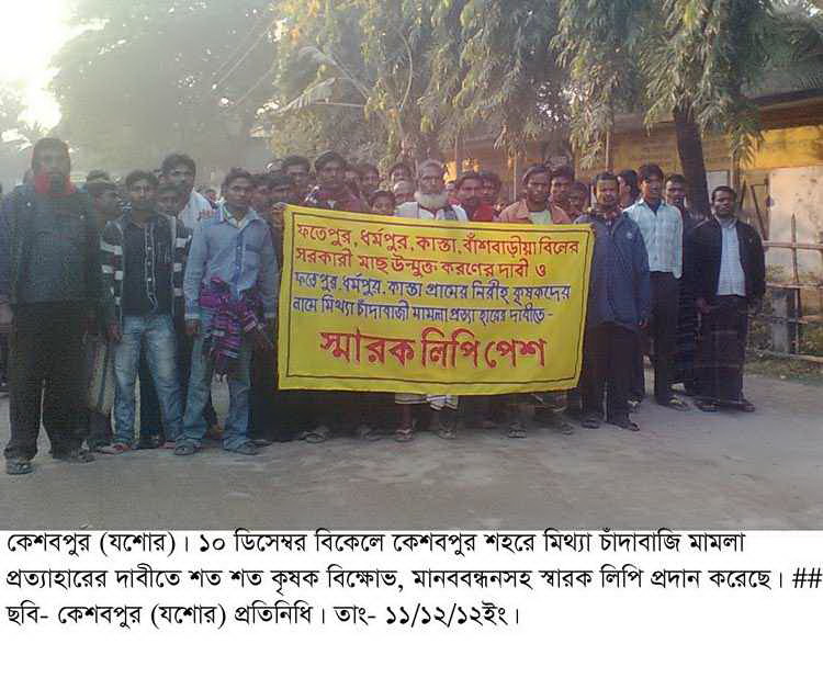 জানা গেছে, কেশবপুর উপজেলার সাগরদাঁড়ী ইউনিয়নের ফতেপুর বিলে “যশোর জেলার ভবদহ অঞ্চলে মৎস্য চাষ ও ব্যবস্থাপনা প্রকল্পের” আওতায় সরকারী পর্যায়ে চলতি বছরে আগষ্ট মাসে ১১৪.৫ মণ মাছের পোনা অবমুক্ত করে। ফতেপুর বিল সংলগ্ন গ্রামের কৃষক রুস্তম গাজী, আব্দুল্যাহ শেখ, শাহিনুর রহমান, আব্দুল খালেক বলেন, এ মাছ আত্বসাত করতে ঘের ব্যবসায়ীসহ কতিপয় প্রভাবশালী ব্যক্তি নানা তৎপরতা শুরু করে। এতৎপরতার অংশ হিসেবে ঘের মালিক কামরুজামান বিশ্বাস, মেম্বার আব্দুল মজিত কৃষকদের নামে কেশবপুর থানায় পৃথক পৃথক দুটি চাঁদাবাজির মামলা করেন। যার মামলা নং-১৮ ও ২০। কোন প্রকার তদন্ত ছাড়াই ঐ চাঁদাবাজির মামলা থানা কর্তৃপক্ষ রেকর্ড করে। কেশবপুর থানা পুলিশ ২৬ নভেম্বর গভীর রাতে অভিযান চালিয়ে কাস্তা গ্রামের মতলেব শেখের পুত্র হানিফ শেখ, মৃত মমিন শেখের পুত্র শাহিনুর শেখ, ফতেপুর গ্রামের চাঁদ আলীর পুত্র আব্দুল খালেক, লিয়াকত মোল্যার পুত্র হাবিবুর রহমান, চিংড়া গ্রামের তারাই গাজীর পুত্র মতলেব গাজীকে আটক করে আদালতে সোর্পদ করে। এ চাঁদাবাজি মামলাকে সম্পুর্ন মিথ্যা দাবী করে তা প্রত্যাহারের দাবীতে শত শত কৃষক ১০ ডিসেম্বর বিকেলে কেশবপুর শহরে বিক্ষোভ মিছিল, মানব বন্ধন কর্মসূচি পালনসহ স্থানীয় এমপি হুইপ ওহাবকে স্বারক লিপি প্রদান করেছেন। এ সময় হুইপ অধ্যক্ষ শেখ আব্দুল ওহাব এমপি বিষয়টি দেখবেন বলে কৃষকদের আশ্বাস প্রদান করেন।