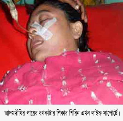 চপল সাহা,বগুড়া থেকে,এসবিডি নিউজ24 ডট কমঃ বগুড়ার আদমদীঘি উপজেলার ডুমুরী গ্রামে একদল সন্ত্রাসী শিরিন আক্তার (২৩) নামের স্বামীকে পরিত্যাগ করা এক কলেজ ছাত্রীর দু’পায়ের রগ কেটে ও গলায় ফাঁস দিয়ে শ্বাসরোধ এবং বুকে ধারালো অস্ত্রাঘাত করে হত্যার চেষ্টা চালিয়েছে। লোমহর্ষক এ ঘটনাটি ঘটেছে ১৩ ডিসেম্বর (বৃহস্পতিবার) বিকেলে। শিরিনা এখন মৃত্যুর সাথে পাঞ্জা লড়ছে। তাকে ঢাকা এ্যাপোলো হাসপাতালে লাইফ সাপোর্টে রাখা হয়েছে। এ ব্যাপারে শিরিনের বাবা আজিজার রহমান বাদী হয়ে শুক্রবার রাতে শিরিনের সাবেক স্বামী সোহেল ইবনে করিম সহ ৬ জনের বিরুদ্ধে আদমদীঘি থানায় একটি মামলা দায়ের করেছেন। মামলা সূত্রে জানা গেছে, উপজেলার ডুমুরিগ্রামের আজিজার রহমানের মেয়ে শিরিন আক্তার প্রায় দেড় বছর পূর্বে উপজেলা সদরের তালশন গ্রামের আব্দুল করিমের ছেলে সোহেল ইবনে করিমের (২৮) সাথে প্রেমের সম্পর্ক গড়ে বিয়ে করে। বিয়ের কিছু দিন পর থেকে স্বামী সোহেল যৌতুক দাবি করে স্ত্রী শিরিনাকে শারীরিক নির্যাতন চালিয়ে আসছিল। এর এক পর্যায়ে শিরিনা বাবার বাড়ীতে চলে আসে এবং চলতি সালের ১৮ আগস্ট স্বামী তালাক করে। এর পর থেকে শিরিন আকতার তার বাবার বাড়ী ডুমুরীগ্রামে থেকে আদমদীঘি সদরের রহিম উদ্দিন ডিগ্রী কলেজে পড়াশোনা চালিয়ে আসছিল। উক্ত কলেজের শেষ বর্ষের পরীক্ষার্থী।