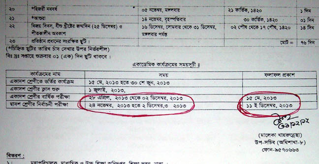 নিজস্ব প্রতিনিধি,এসবিডি নিউজ24 ডট কমঃ ভুলে ভরা শিক্ষা মন্ত্রণালয়ের সরকারি ও বেসরকারি কলেজ, আলিয়া মাদরাসা, টিটি কলেজ ও গবর্নমেন্ট কমার্শিয়াল ইনস্টিটিউটের একাডেমিক ক্যালেন্ডার ২০১৩। শিক্ষা মন্ত্রণালয়ের অধিশাখা ৮ এর উপ-সচিব মালেকা খায়রুন্নেছা স্বাক্ষরিত একাডেমিক ক্যালেন্ডারে লেখা আছে একাদশ শ্রেণির বার্ষিক পরীক্ষা ২৮ এপ্রিল ২০১৩-এ শুরু হবে এবং ২ ডিসেম্বর শেষ। কিন্তু ফলাফল প্রকাশ করতে বলা হয়েছে ১৫ মে। অপরদিকে দ্বাদশ শ্রেণির নির্বাচনী পরীক্ষার সময় উল্লেখ করতে গিয়ে একটা অবাঞ্ছিত ‘৩’ ছাপা হয়েছে। এছাড়া প্রতিষ্ঠান প্রধানের সংরক্ষিত ছুটির ঘরে লেখা আছে মোট ৭৬ দিন। প্রকৃতপক্ষে ওটা ৭৬ দিন হবে না বলে জানা গেছে।