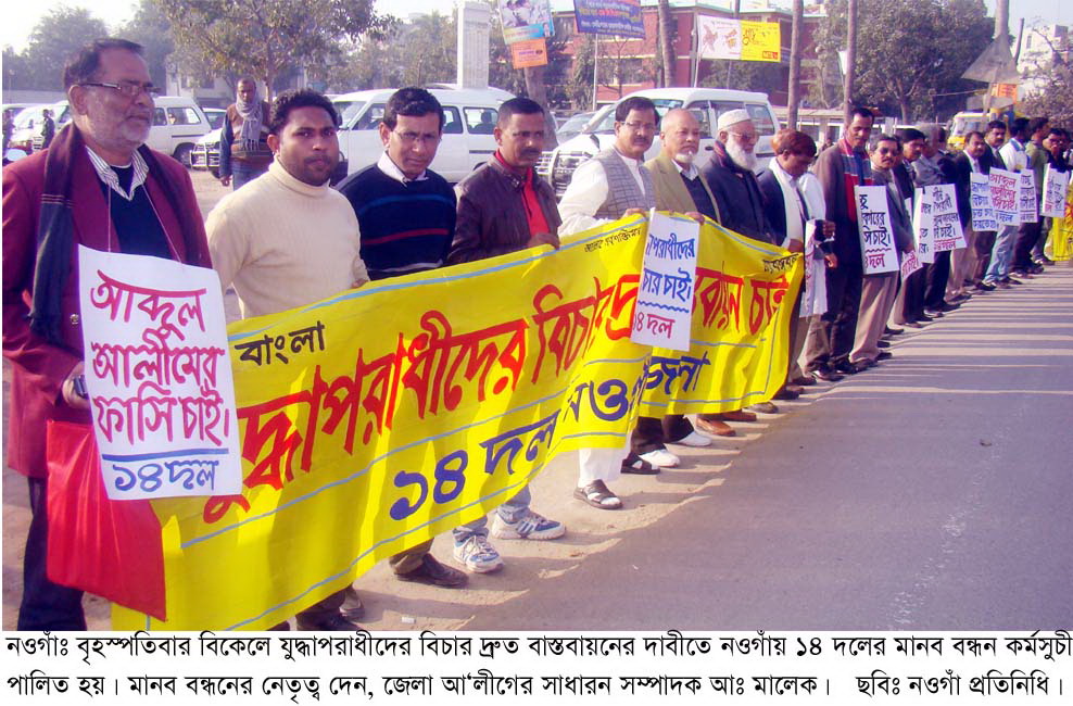 নওগাঁয় যুদ্ধাপরাধীদের বিচার দ্রুত বাস্তবায়নের দাবীতে ১৪ দলের মানব বন্ধন