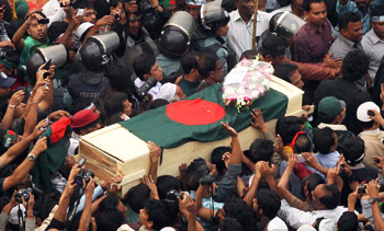 নিজস্ব প্রতিনিধি,এসবিডি নিউজ24 ডট কমঃ ব্লগার এবং শাহবাগ আন্দোলনের অন্যতম উদ্যোক্তা রাজিব হায়দারের প্রথম নামাজে জানাজা অনুষ্ঠিত হয়েছে শাহবাগে প্রজন্ম চত্বরে। ড. সৈয়দ এমদাদ উদ্দিন বিকেল ৫টা ৫৫ মিনিটে জানাজা নামাজ পড়ান। এ সময় শাহবাগ থেকে টিএসসি, রূপসী বাংলাসহ আশপাশের এলাকায় মানুষের ঢল নামে। এর আগে জাতীয় পতাকা নেড়ে রাজিবের মরদেহে শ্রদ্ধা জানায় উপস্থিত জনতা। মুক্তিযোদ্ধা সংসদের পক্ষ থেকে রাজিবের কফিনে পুষ্পস্তবক অর্পন করা হয়। এ সময় রাজিবের মামা মুক্তিযোদ্ধা আলম হায়দারসহ পরিবারের অন্য সদস্যরা উপস্থিত ছিলেন। জানাজার আগে আলম হায়দার বলেন, ‘এখানে যারা উপস্থিত তাদের হাতে এ লাশ দিয়ে গেলাম। তারাই এ হত্যাকাণ্ডের বিচার করবে। এ লাশ এ প্রজন্মের লাশ। একাত্তরের ঘাতকদের এত সাহস আসে কোথা থেকে?’ তিনি ঘাতকদের উদ্দেশ্যে বলেন, ‘সাহস থাকে যদি তাহলে প্রজন্ম চত্বরে এসে আমাকে মার।’ ব্লগার ডা. ইমরান হায়দার বলেন, ‘আজ আমাদের সামনে আমাদেরই এক সহকর্মীর লাশ। এ অবস্থায় বক্তব্য দেয়ার মতো মানসিকতা আমাদের নেই। মুক্তিযুদ্ধ প্রজন্মের যে কোনো অনুষ্ঠানে রাজিবকে ডাকতে হত না। সে নিজ উদ্যোগে চলে আসতো। আমরা তার খুনিদের ফাঁসি চাই। আমাদের নতুন প্রজন্মের মুক্তিযুদ্ধ চলবে।’ এ সময় উপস্থিত সবাই মুষ্ঠিবদ্ধ হাত উপরে তুলে রাজিব হত্যার সুষ্ঠু বিচারের জন্য আজীবন সংগ্রাম চালিয়ে যাওয়ার প্রতিজ্ঞা করেন। জানাজার পর রাজিবের মরদেহ মিরপুরের উদ্দেশ্যে রওয়ানা হয়। সেখানে তার দ্বিতীয় নামাজে জানাজা অনুষ্ঠিত হবে বলে জানা গেছে।