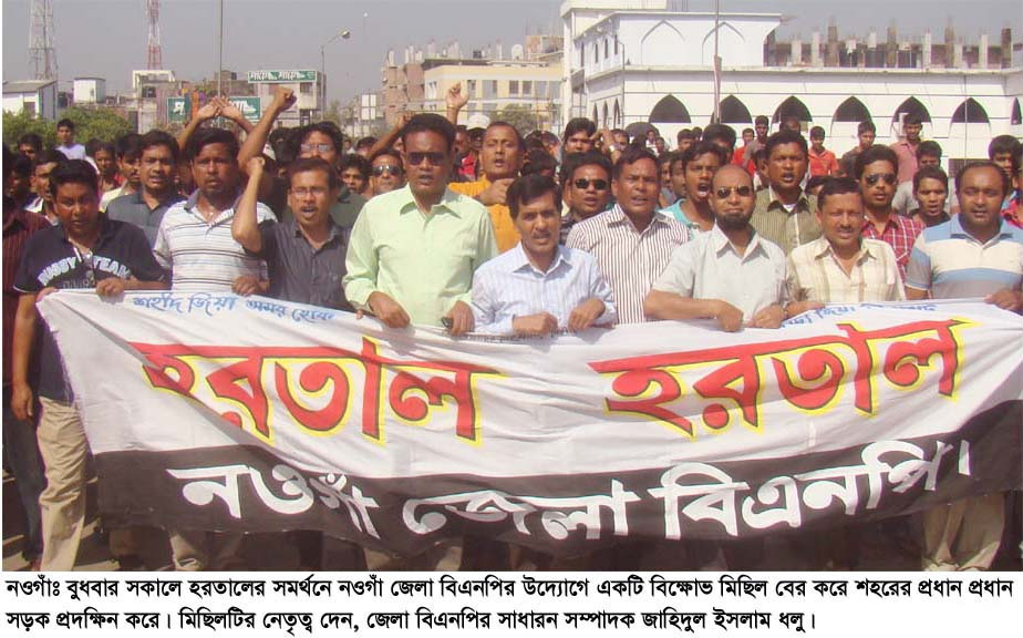 আব্বাস আলী,নওগাঁ প্রতিনিধি,এসবিডি নিউজ24 ডট কমঃ নির্দলীয় নিরেপেক্ষ তত্বাবধায়ক সরকারের অধীনে নির্বাচন ও বিএনপির যুগ্ম মহাসচিব রুহুল কবির রিজভীসহ গ্রেফতারকৃত নেতাকর্মীদের মুক্তি এবং মিথ্যা মামলা প্রত্যাহারের দাবীতে নওগাঁয় ১৮ দলের হরতাল শান্তিপূর্ন ভাবে পালিত হয়েছে। ২৭ মার্চ (বুধবার) সকাল থেকে শহরের বিভিন্ন স্থানে মোড়ে মোড়ে পিকেটিং করে বিএনপি ও জামায়াতের নেতাকর্মীরা। হরতালের সমর্থনে জেলা বিএনপির একটি মিছিল শহরের মুক্তির মোড় থেকে বের করে শহরের প্রধান প্রধান সড়ক প্রদক্ষিন করে তাজের মোড়ে গিয়ে শেষ হয়। মিছিলটির নেতৃত্ব দেন, জেলা বিএনপির সাধারন সম্পাদক জাহিদুল ইসলাম ধলু। সমাবেশে জেলা বিএনপির ভারপ্রাপ্ত সাংগঠনিক সম্পাদক আঃ মতিন তালুকদার, মহিলা দলের শবনম মোস্তারী কলি, জেলা যুবদলের সভাপতি বায়েজিদ হোসেন পলাশ, জেলা যুবদল নেতা খালিদ হাসান লিপ্ত, জেলা ছাত্রদলের ভারপ্রাপ্ত আহবায়ক শফিউল আজম ওরফে ভিপি রানা, মোক্তার, শামীম প্রমুখ বক্তব্য রাখেন।