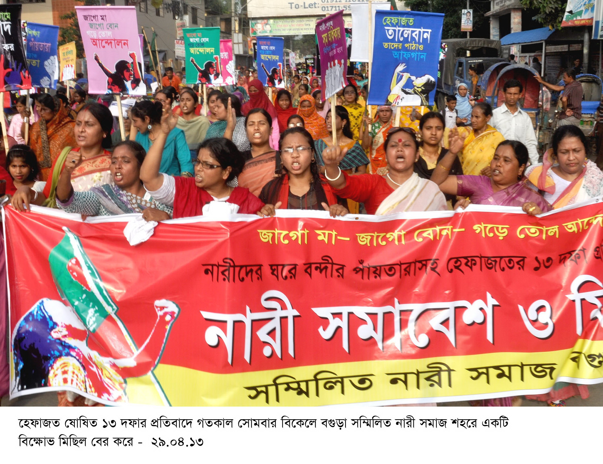 সমাবেশে নারী নেত্রীরা বলেন, দেশে যখন নারী-পুরুষ সমতার ভিত্তিতে উন্নয়নের পথে অগ্রসর হচ্ছে সেই মুহুর্তে একটি মৌলবাদী ও সাম্প্রদায়িক গোষ্ঠী মাথাচাড়া দিয়ে উঠেছে। তারা নারী সমাজকে গৃহবন্দি করে দেশকে অন্ধকারযুগে নিয়ে যেতে চায়। এই অবস্থাকে প্রতিহত করতেই হবে। হেফাজতে ইসলাম নামে ওই মৌলবাদী ও সাম্প্রদায়িক গোষ্ঠী ঘোষিত ১৩ দফা দাবির বিরুদ্ধে সোচ্চার হওয়ার পাশাপাশি তাদের প্রতিহত করতে রাজপথে অন্দোলন অব্যাহত রাখার প্রত্যয় ব্যক্ত করেন বক্তারা।